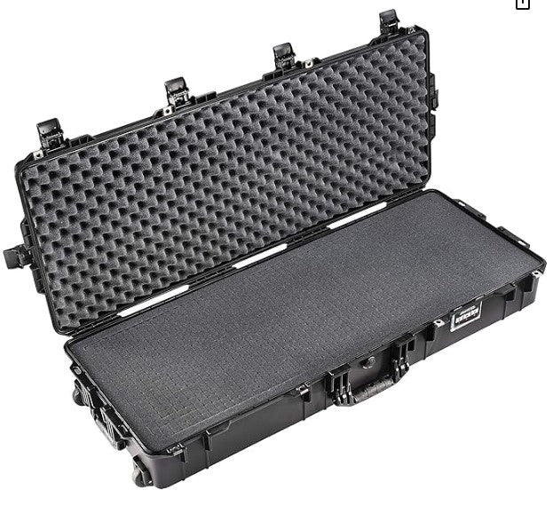 Transport case with foam, vent and wheels, black, Dimensions (LxWxH Inches): exterior 46.69 × 19.36 × 8.73", interior 44.01 × 16.77 × 7.94", Weight 21.06 lbs. with foam Large enough to fit two Heavy-Duty tripods and some accessories. INTERNATIONAL SHIPMENT IS EXPENSIVE DUE TO SIZE.