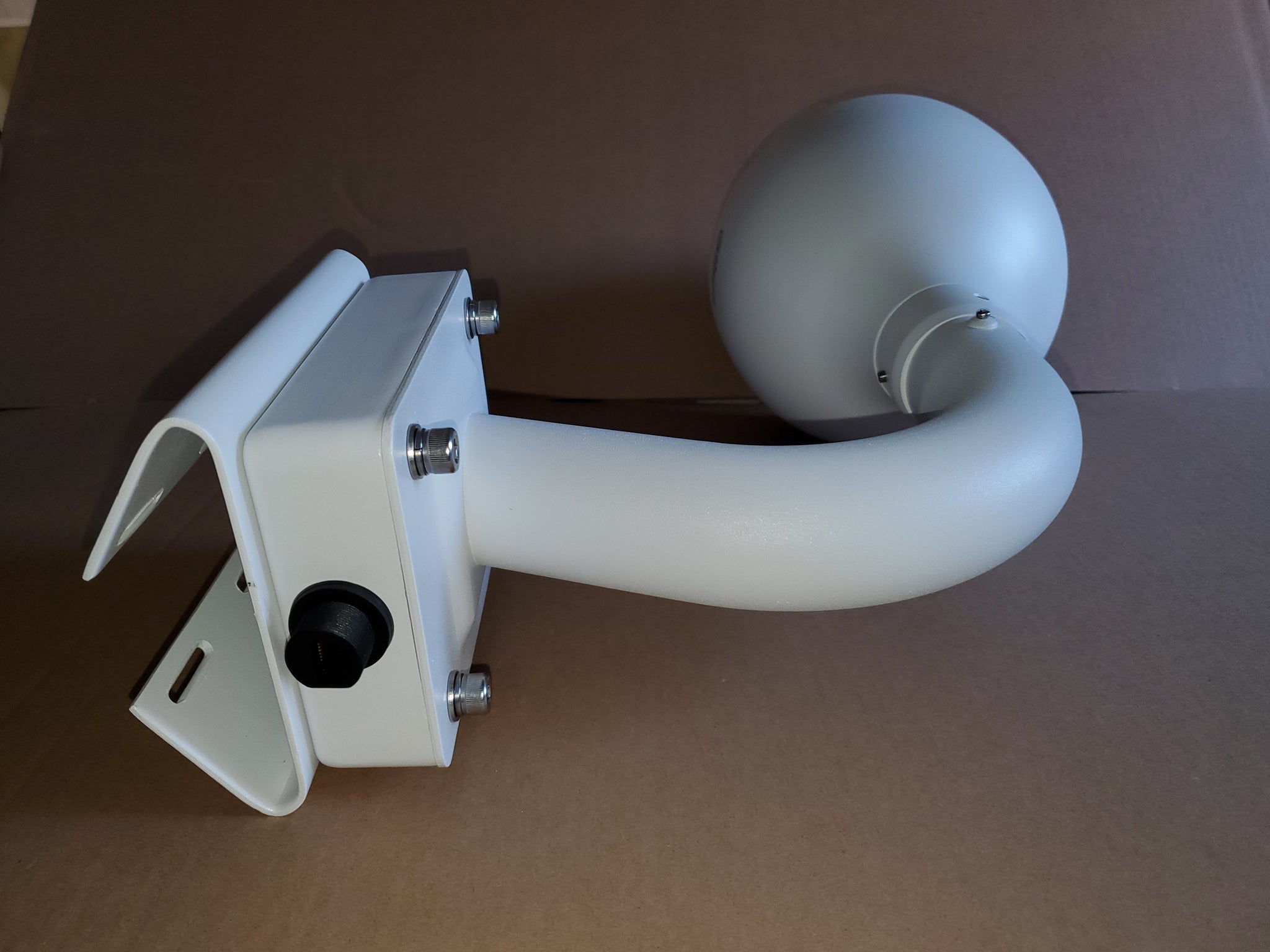 PTZ Camera pole mounting Assembly with righrt-angle tubular mount, junction box, stainless steel straps and 3/4" NPT gland nut. If a PTZ camera is ordered, it will also be assembled to the mount. If a cable is ordered, it will be installed using the gland nut.