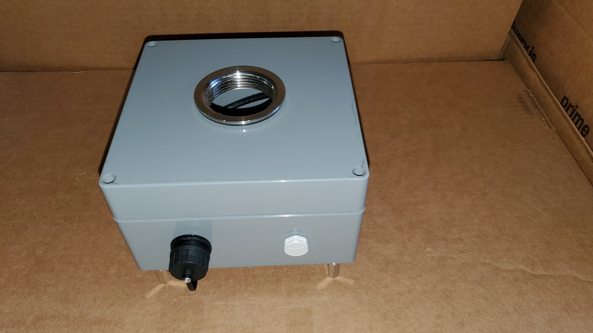 Waterproof rugged aluminum junction box assembly for PTZ camera mount. Includes camera to G1-1/2 threaded adapter, oring to waterproof adapter-camera interface for vertical mounting and internal cable for camera to waterproof Ethernet connector.